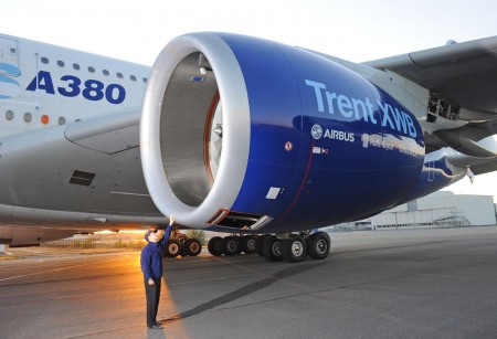 Tas la instalación del motor Trent XWB en el ala del Airbus A380, ahora se están realizando una serie de pruebas en tierra y el primer vuelo del avión con el nuevo motor se espera se realice en unas semanas.