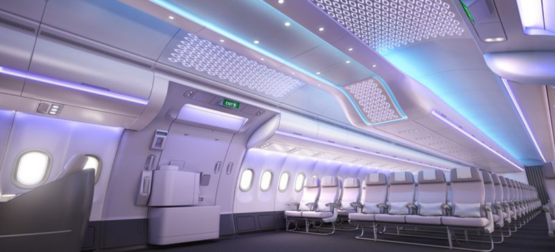 La nueva cabina, inspirada en la del nuevo A350 XWB, incluye la última tecnología de iluminación LED y es más amplia y moderna que las cabinas convencionales permitiendo a los pasajeros disfrutar de un espacio mayor.