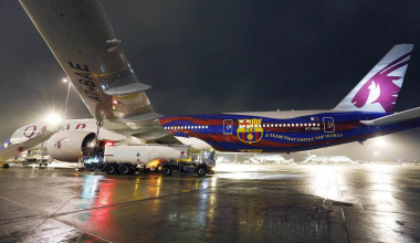 OOtras Ver Más Qatar Airways pinta su primer avión del FC Barcelona.febrero 17, 2014 El Boeing 777-300ER A7-BAE es el primer avión de Qatar Airways en lucir los colores del Futbol Club…